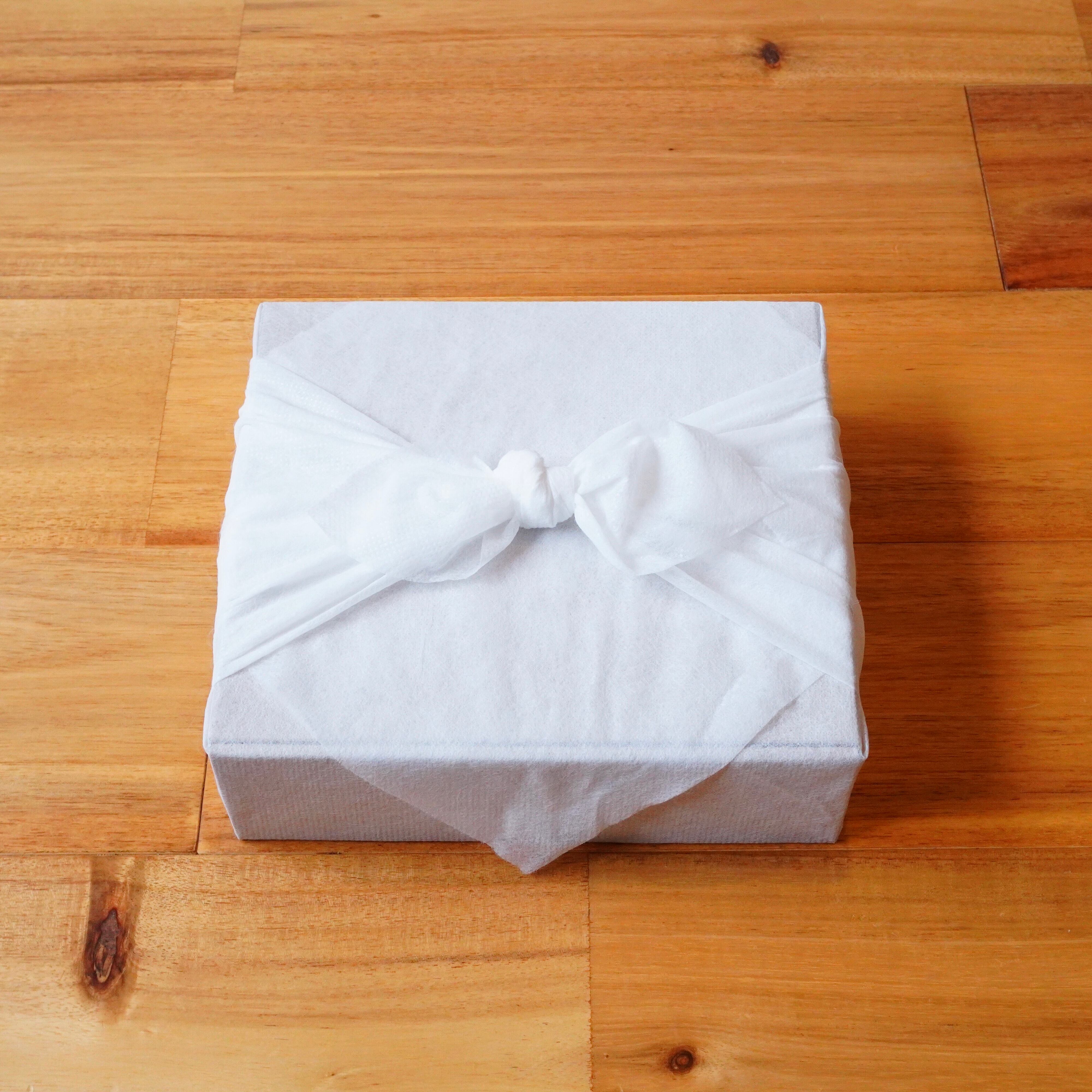 ベージュゴールドのギフト箱は洗練された雰囲気で、当ブランドオリジナルの白風呂敷のギフトラッピングも大好評。